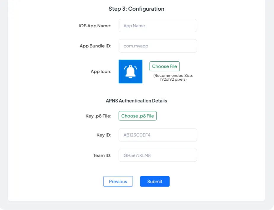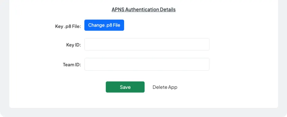 If you’re adding a new iOS app to the PushAlert dashboard, simply upload the .p8 file generated above and enter your Key ID and Team ID in the respective fields while you're configuring it.