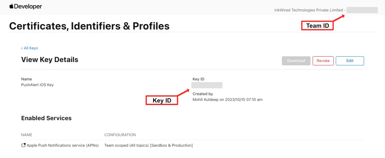 - Download the .p8 key and store it securely, Apple only allows it to be downloaded once.