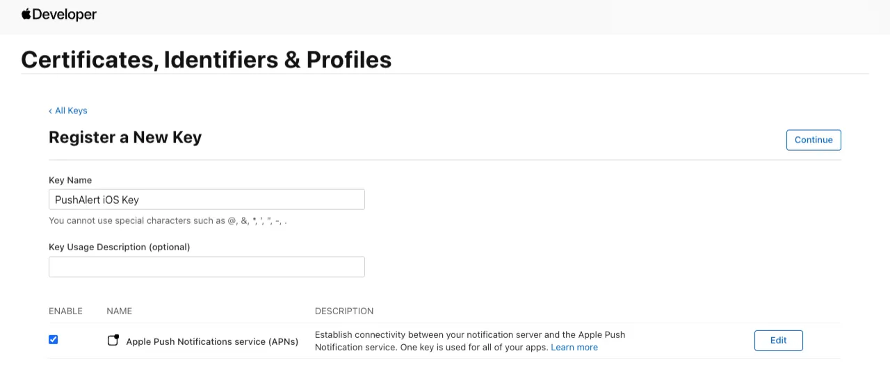Generate and Configure an iOS .p8 Key for Token-Based APNs Connection